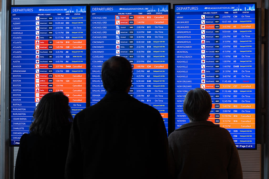 Travelers look at a flight status board as flights are delayed and cancelled following a significant winter storm at Ronald Reagan Washington National Airport in Arlington, Virginia, January 26, 2026.