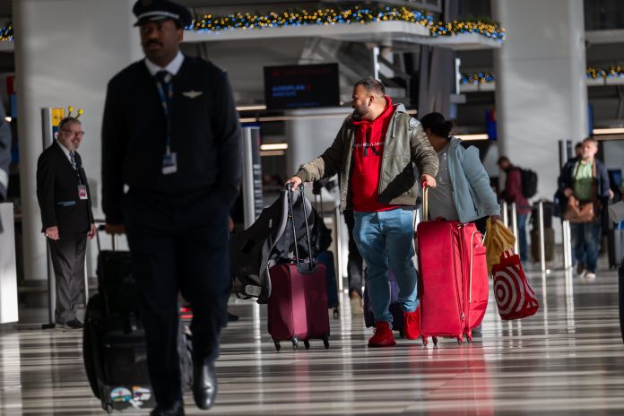 Travelers line up at the security checkpoint at O’Hare International Airport in Chicago, Illinois, on November 22, 2024, ahead of the upcoming Thanksgiving holiday.